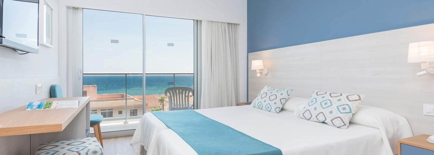 La chambre double vue mer bénéficie d’une vue privilégiée sur la mer. Elle a un balcon ou une terrasse avec table et chaises, une salle de bains complète, des lits de 190X90 et un bureau.